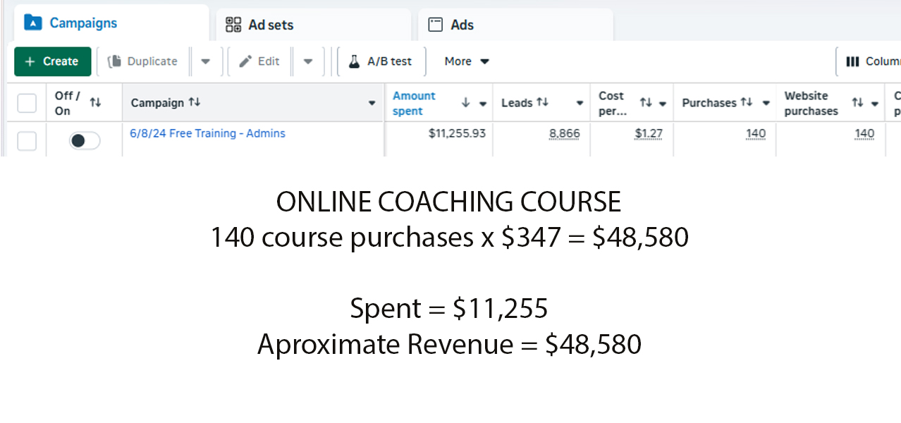 140 course purchases at $347 each = $48,580 in revenue